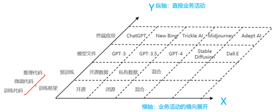 商业模式创新的起点可以源于对共生体中不同角色的选择,这能够帮助企业定位其边界以及交易的主体。如下图2所示,这是一个大模型共生体的三轴工具。其中,Y轴代表了上下游直接业务活动,包括了搭建训练框架、预训练、输出模型文件和终端应用等。X轴是直接业务活动的横向展开,在不同的直接业务活动层面进一步区分出不同的活动。例如,训练框架、预训练数据可以选择是开源、闭源(私有)还是混合;在模型文件环节可以选择GPT-3、GPT-4、Stable Diffusion等不同的训练好的模型参数数据;在终端应用环节可以切入对话、搜索、画图、写作等多样化场景。除此以外,Z轴代表了业务活动的竖向分层。例如,针对提供模型文件这一业务活动,将已有训练好的模型参数数据当作基础模型,企业可以通过模型微调使用特定领域或任务相关的全量或增量语料,对模型进行进一步训练。在模型微调的基础上企业可以提供客户的私有模型部署,客户将系统的组件和服务部署在自己的私有数据中心或基础设施中,不仅满足了对数据隐私和安全性的要求,还可以进行定制开发以满足特定的业务需求。