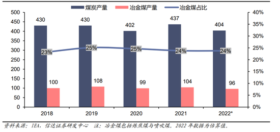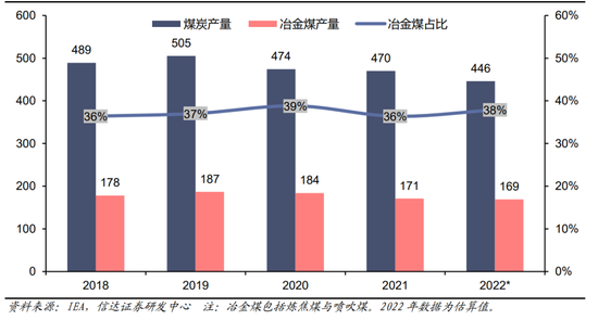 图41:2018-2022澳大利亚冶金煤产量占比(百万吨,%)