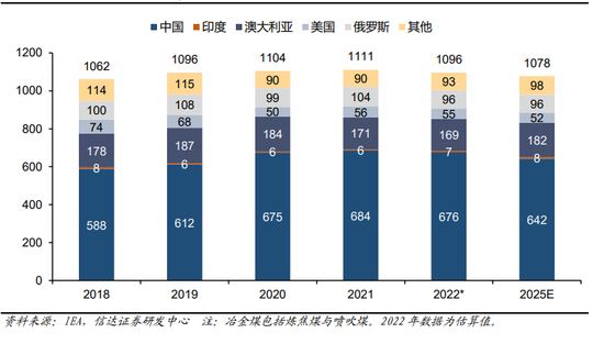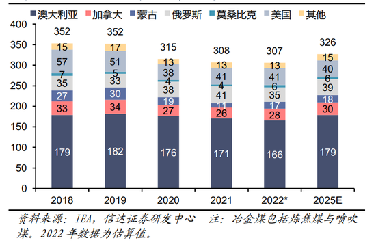 全球冶金煤贸易量呈上升趋势。根据IEA数据统计,全球2022年冶金煤(炼焦煤+喷吹煤)估算出口量为3.07亿吨,同比基本持平。展望2025年,IEA预计冶金煤出口量将达到3.26亿吨,与2022年相比增长1900万吨(+6.19%),CAAGR2022-2025为2.1%。