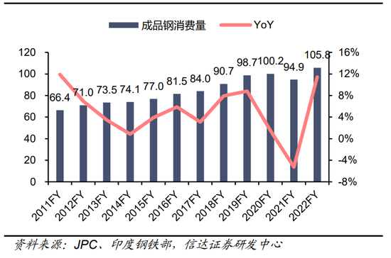 图37:印度成品钢消费量(百万吨,%)