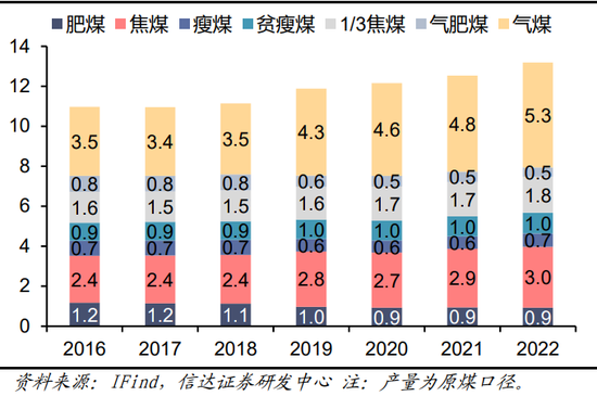 图23:2016-2022年我国炼焦煤分煤种产量(亿吨)
