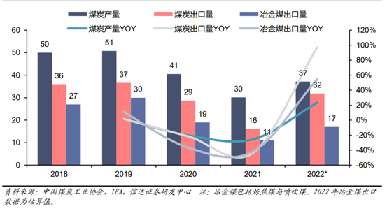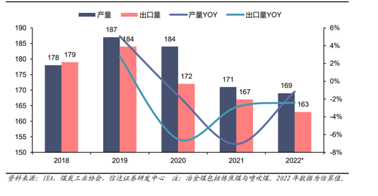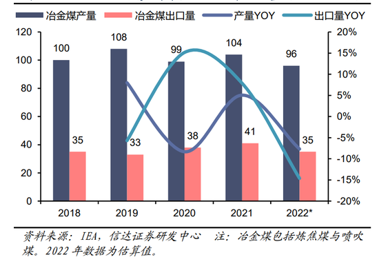 图42:2018-2022澳大利亚冶金煤产量、出口量(百万吨)