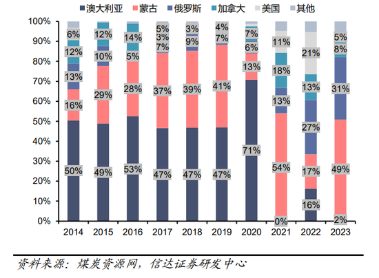 图6:2014-2023年Q1我国炼焦煤分国别进口结构(%)