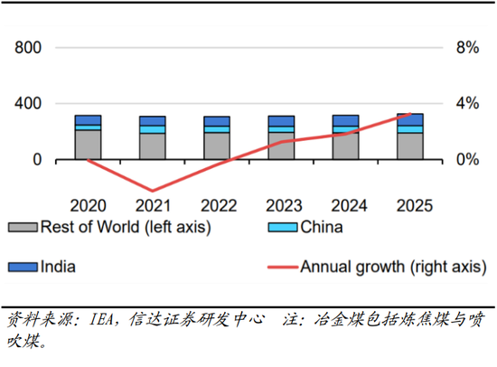 图32:2018-2025全球冶金煤产量(百万吨)