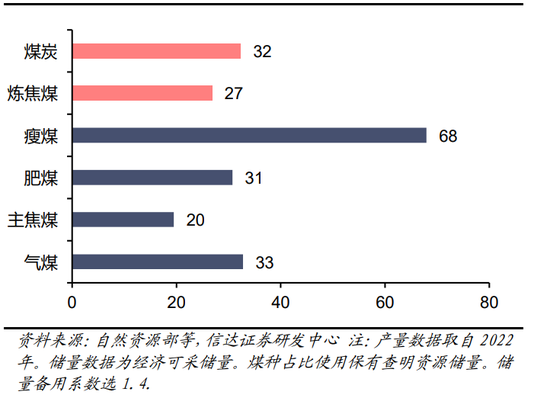 主焦煤、肥煤高度匹配钢铁工业高质量发展需要,但在我国的煤种占比中结构性稀缺。在钢铁工业高质量发展中,高炉大型化是重要趋势。大型高炉对焦炭反应强度(CSR)的要求更高,一般来说,提高CSR需要增加炼焦配煤中主焦煤和肥煤的配比。随着高炉大型化的持续推进,对于主焦煤、肥煤等结构性煤种的需求有望持续提升(详见信达能源《我国炼焦煤需求总量与结构深度研究》)。反观我国炼焦煤资源特性,主焦煤保有储量517.6亿吨,占比17.5%,2022年产量为3亿吨,占比23%,均远远低于41.79%的平均配比。肥煤保有储量239.6亿吨,占比8.1%,2022年产量为0.9亿吨,占比7%,同样远远低于17.08%的平均配比。未来随着钢铁工业高质量发展,主焦煤、肥煤结构性稀缺的局面或将进一步加重。