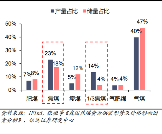 图26:我国炼焦煤分煤种产量占比与储量占比对比(%)