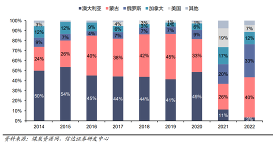 图4:2014-2022我国炼焦煤分国别进口量(%)