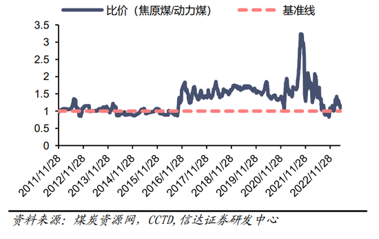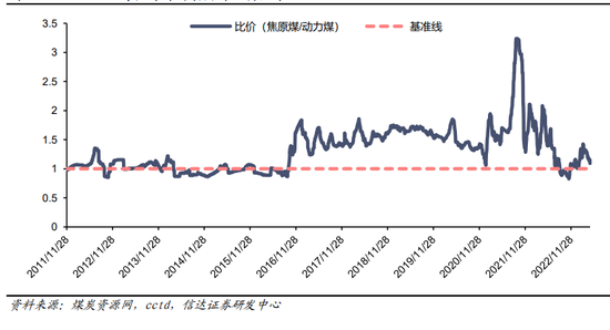 图2:2011-2023年焦原煤与动力煤比价关系