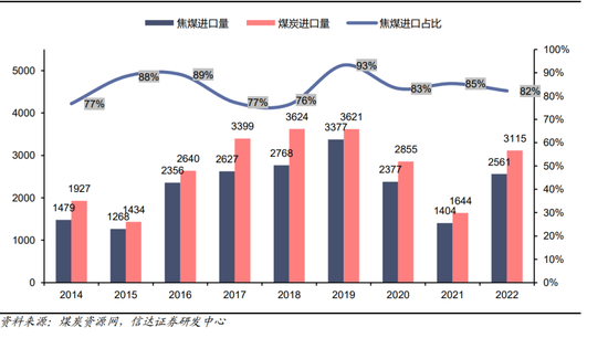 我国进口蒙煤中焦煤占比高。2022年我国进口蒙古煤炭3115万吨,同比增长89.4%。其中进口焦煤2561万吨,同比+82.5%。占煤炭进口量比例为82%,同比有所下降。