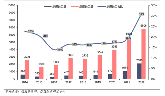 进口俄煤中焦煤占比快速提高。2022年我国进口俄罗斯煤炭6806万吨,同比增长19.4%。其中进口焦煤2100万吨,同比+95.6%。占煤炭进口量比例大幅提高至31%,同比提高12pct。