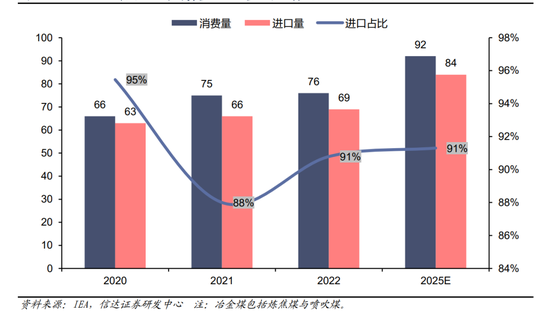图39:2020-2025印度冶金煤消费量、进口量变动趋势(百万吨,%)