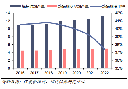 保供压力下焦精煤产量、洗出率持续下降。据煤炭资源网统计,焦原煤占全国原煤产量比例已由2016年的40.5%下降至2022年的29.3%。此外,2019年以来,焦精煤洗选率逐步下降,尤其是当前煤炭增产保供背景下,部分焦煤企业为完成电煤保供任务,增加电煤保供量,进一步降低洗选率,2022年炼焦煤洗出率仅为37.4%,相较2021年的39.1%再次降低1.7pct。