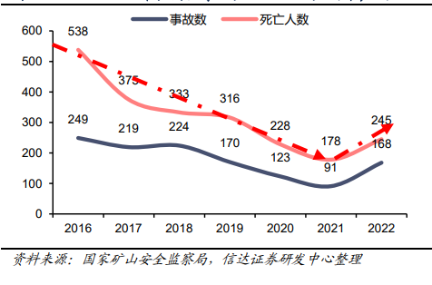 图30:2016-2022煤矿安全事故数及死亡人数(个,人)
