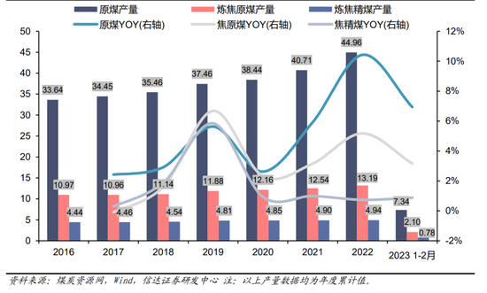 我国炼焦煤产量增速总体低于煤炭产量增速,焦精煤产量增速尤其缓慢。从2016年至今的历史产量数据来看,除2019年外,其余年份炼焦煤产量增速均低于原煤产量增速,且近几年增速差距越来越大。2022年我国原煤产量44.96亿吨,同比+10.4%;炼焦原煤产量为13.19亿吨,同比+5.2%;炼焦精煤产量4.94亿吨,同比+0.7%。2016-2022年,7年间,我国原煤产量增长了33.65%(CAGR4.95%),焦原煤产量增长了20.22%(CAGR3.12%),焦精煤产量增长了11.06%(CAGR1.76%),原煤增速远远高于炼焦煤产量增速,炼焦精煤产量增速也远远低于炼焦原煤,且差距同样越来越大。由于炼焦煤转为动力煤使用的现象存在(不进行洗选),相比焦原煤产量,焦精煤产量更能体现出焦煤资源的供给弹性不足(7年仅增长11.06%),反映了焦煤的稀缺性。
