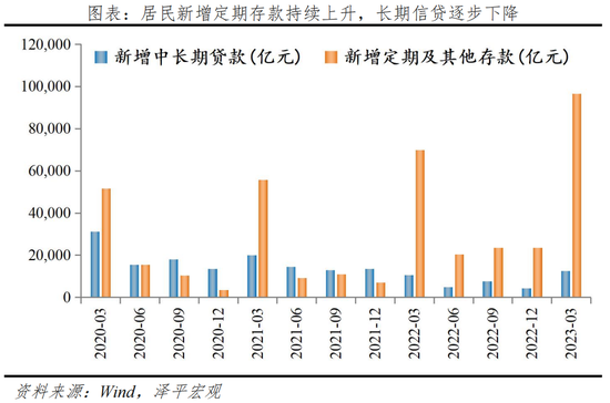 居民负债端看,我国居民的杠杆率已处于较高水平,居民储蓄预防风险的需求依旧较大。近十年来我国居民的杠杆水平处于快速上身通道,至2020年增速出现显著放缓。横向对比,居民杠杆率与发达经济体差距持续缩小,目前已经超过欧元区国家的平均水平。但欧元区2022人均GDP为4.0万美元,相比较当前我国人均GDP为1.27万美元,居民承担负债压力较大,预防性储蓄需求依旧强烈。一季度新增定期存款创历史新高的情况下,居民新增长短贷低于疫情三年的同期历史均值,长贷一季度环比短暂回暖后4月重回拖累,居民信贷意愿疲软,寻求主动降低杠杆。