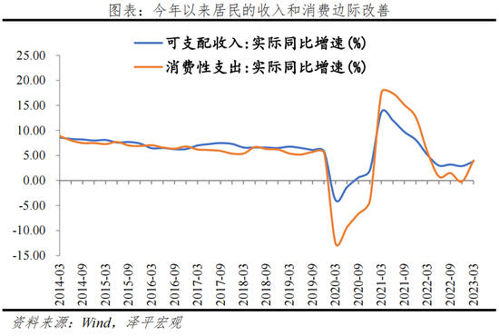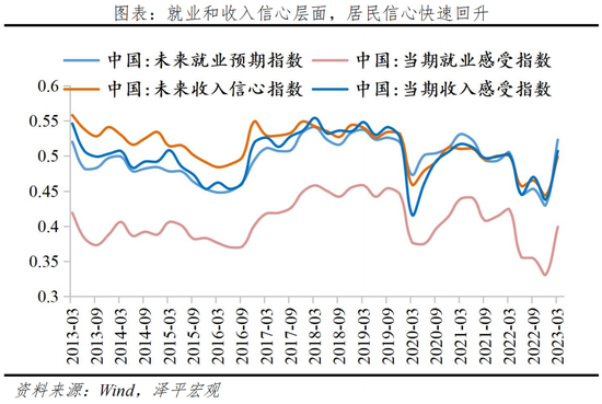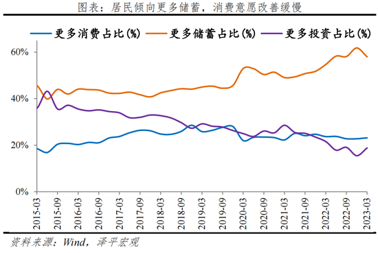 第四,居民储蓄意愿边际改善,但依旧相对高位。根据央行城镇储户调查问卷,2020-2022年,居民储蓄意愿中更多储蓄占比由疫情前的45.7%升至2022Q4 高点的61.8%,疫后平均每年上升5.4个百分点。今年一季度边际有所改善回落至58%,但距2019年同期差距依旧较大。投资需求出现一定的回暖,但居民的消费意愿恢复较慢,甚至低于过去三年23.5%的平均水平,直接体现了居民更趋保守、谨慎。