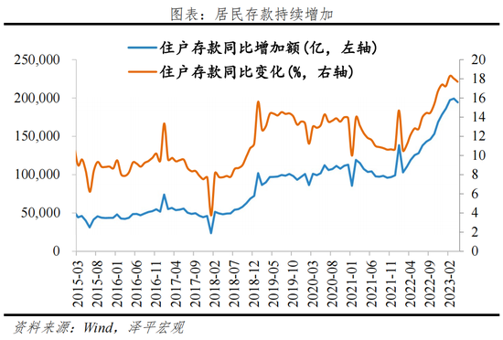 第二,去年至今住户存款总量高增,银行存款利率降低影响有限。截至2023年3月,我国住户存款规模为130.2万亿元,一季度新增存款9.8万亿元,仅三个月便达到2022全年17.8万亿新增存款的55.5%,而2019年全年存款仅增长9.7万亿,3月份新增存款较去年同比上涨18%,三年平均年化增长14%。