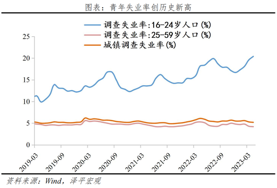 收入端层面,居民可支配收入边际改善,就业较为疲软,促使高储蓄释放较为缓慢。第一季度可支配收入和支出同比增速恢复至3.8%和4%,城镇居民调查中选择“当期收入增加”的占比增高5.1%,居民的未来就业和收入信心明显回升。但同时自2022年初至今年第一季度,城镇居民单季可支配收入平均增速仅为4.2%,低于前值,收入未出现显著提升;就业层面,今年4月16-24岁就业人群的调查失业率升至20.4%,青年就业问题迫在眉睫。收入增速缓慢叠加青年就业问题叠加,当前制约居民部门的风险偏好,延迟预防性储蓄的转化。