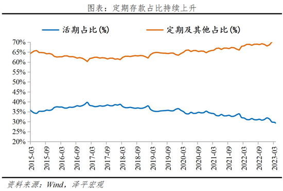 第三,居民端存款定期化趋势明显,信贷意愿疲软。2018年以来,定期存款占比持续上升,截至2023年2月,定期存款占存款比重高达70.2%,为近十年最高水平。一季度新增定期存款创历史新高的情况下,居民新增长短贷低于疫情三年的同期历史均值,信贷意愿疲软。