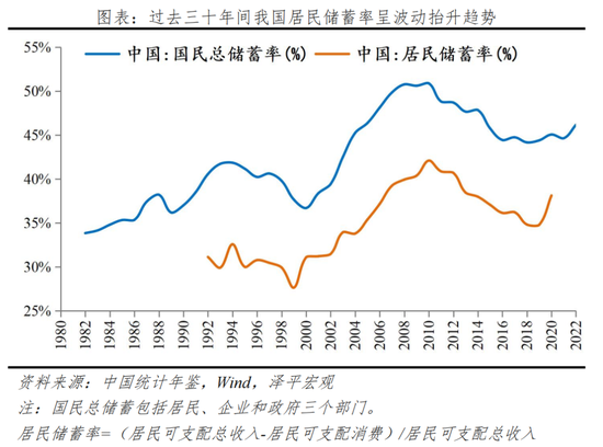 第一,2020年以来居民储蓄率抬升,目前趋势未见转折。近十年国民储蓄率一直处于下行通道,2010年-2019年居民储蓄率下降7%至34.8%,2020年受突发事件影响陡升至38%,随后略有回落。但2022年以来,我国居民储蓄率又重回上升通道,据估算2022年末居民储蓄率已经超2020年水平。