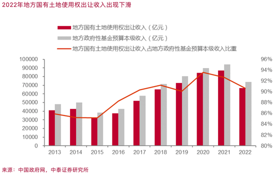 当前市场对地方政府债务增长和财政收入增速下降甚至负增长的现象普遍担心,尤其是财力偏弱的东北、中西部省份,城投债收益率普遍高于东部发达省市。2022年13个省份土地出让金对政府债务利息覆盖程度不足100%(2021年只有5个),扣除城投拿地之后,捉襟见肘的情况更加明显。