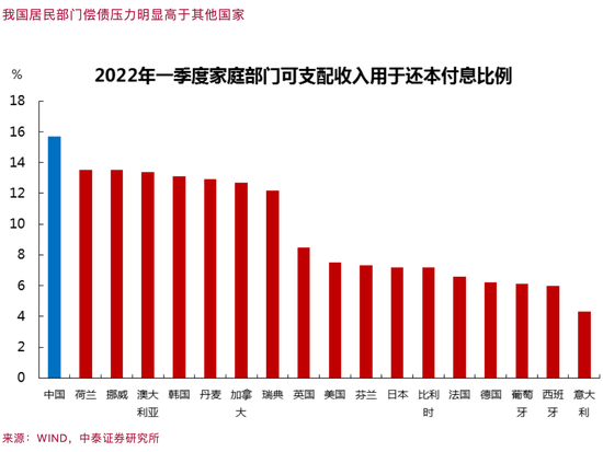 2021年居民部门杠杆率达到62%,基本与发达国家接近。而且,由于我国居民可支配收入占GDP比重偏低,如2022年一季度中国家庭部门的债务余额/可支配收入为141.8%,可支配收入用于还本付息的比例为15.7%,都高于美、英、德、法、日等发达国家。