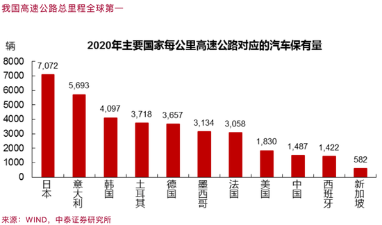 关于是否存在基建投资超前,一直有争议。但某些领域的“基建超前”,还是比较显见的。例如,我国乘用车销量已经位居全球第一,对应地,我国不断增加公路的总里程。中国汽车保有量超过3亿辆,成为全球第一,因此高速公路总里程超过美国也是合理的。但问题在于,超过多少是合适的?从2020年数据看,我国每公里对应的汽车保有量为1422辆,美国为1830辆,显然,我国高速公路上跑的车比美国少,也意味着高速公路可能修多了。