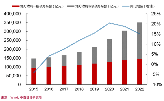 2011年以来,全国城投有息债务快速扩张,每年增速均保持在10%以上,到2022年末,全国城投有息债务为54.1万亿元,相较2011年的6.4万亿元增长了7倍以上。