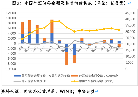 由于这一时期正值百年变局加速演进,国际环境日趋复杂严峻,中资抛售美债一定程度反映了降低对美国金融风险暴露的操作。同期,外国投资者累计净买入美债4148亿美元。当然,造成此种情形也不完全是这方面的原因。2018年以来中国一个重要的政策变迁是,2017年人民币汇率止跌企稳后,进入了有涨有跌、双向波动的新常态。央行回归汇率政策中性,基本退出了外汇市场常态干预,汇率政策灵活性增加。2018~2022年间,中国外汇储备余额累计减少123亿美元,其中,交易引起的外汇储备资产累计2695亿美元,负估值效应2817亿美元。但是,交易引起的外汇储备资产增加主要来自储备投资收益,而非外汇市场干预。同期,交易引起的外汇储备资产累计增加额远小于2009~2013年累计17678亿美元的规模。