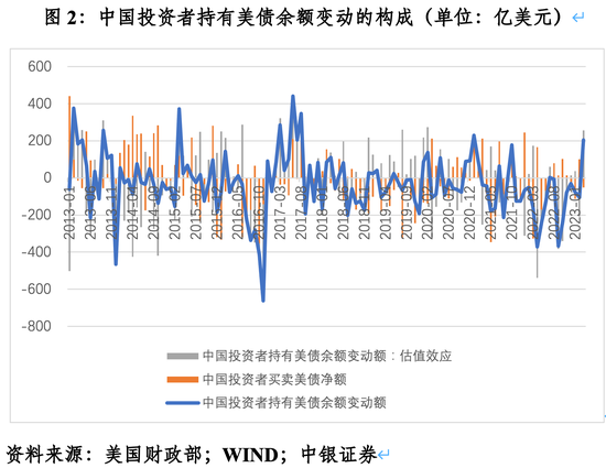 根据TIC的存量和流量数据,2013年12月~2023年3月,中资持有美债余额减少4474亿美元,其中,净卖出中长期美债1706亿美元,净买入短期美国国库券108亿美元,合计净卖出美债1598亿美元,贡献了持有美债余额降幅的35.7%;负估值效应2876亿美元,贡献了持有美债余额降幅的64.3%。可见,中资持有美债余额减少是净减持与负估值效应共同作用的结果,其中负估值效应贡献了总降幅的将近2/3。