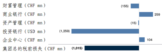 随着新冠疫情蔓延,瑞信投行业务受到较大影响。各国避免接触的防疫政策冲击全球供应链,实体经济受损,投行业务需求减少。瑞信2021年以来业绩大幅下滑(图1),2021年和2022年营业收入分别下降13.9%和19.5%,净利润分别下降342%和161.82%。瑞信和瑞银股价此前几乎同频变动,但今年3月以来,瑞信股价大幅下跌,二者股价走向出现明显分歧(图2)。瑞信各业务板块包括财富管理、商业银行、资产管理、投资银行和企业中心业务亏多盈少(图3)。