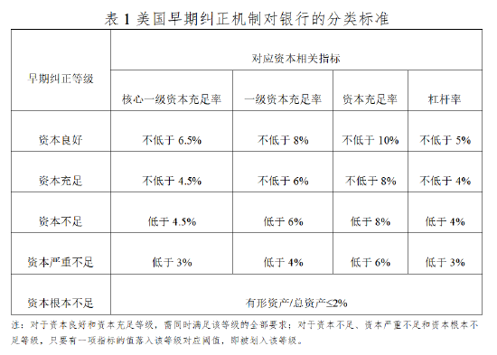 监管机构和FDIC共同对银行实施早期纠正。FDIC按照银行的资本充足情况和杠杆水平,将其划分为资本良好、资本充足、资本不足、资本严重不足和资本根本不足等5个等级(如下表所示)。当银行处于资本不足和资本严重不足的状态时,主要由其监管机构采取早期纠正措施;当银行资本根本不足时,则主要由FDIC对其采取早期纠正措施。