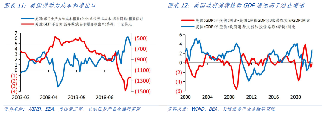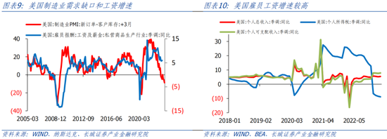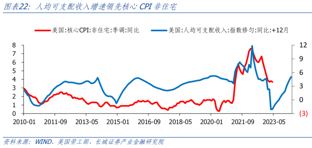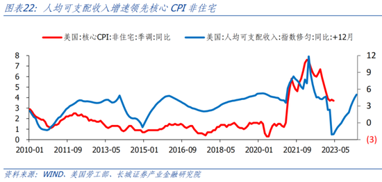 对于非住房部分,居民收入也具有明显的领先作用,大约领先12个月。非住房的CPI商品和服务约占核心通胀的58%。根据领先性,2023年一季度美国人均可支配收入增速大幅反弹至7%以上之后,下半年核心CPI非住房部分同比逐渐回落后也会见底回升。