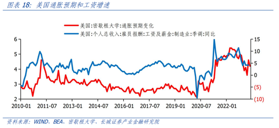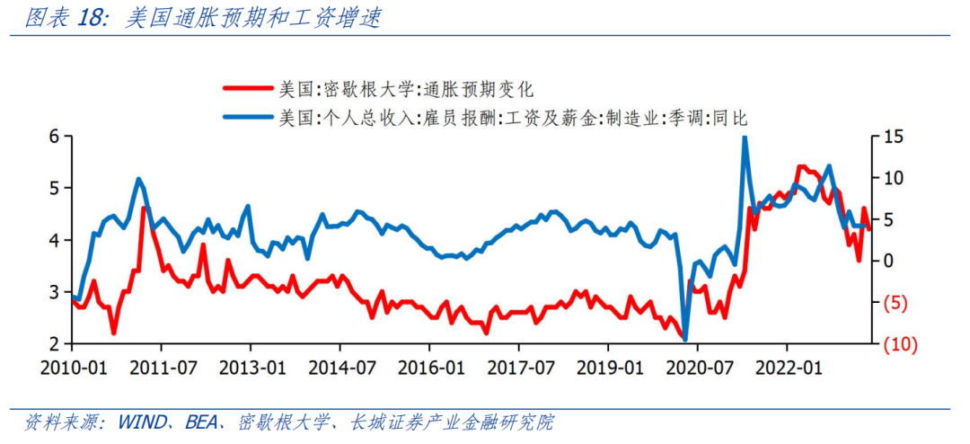 美国为何会出现工资和需求缺口背离的现象?我们认为这与工资-通胀螺旋式上升机制有关。2020年疫情发生之后,随着美国政府纾困法案的实施,供需缺口扩大造成通胀形势快速恶化。表现之一就是通胀预期大幅上扬,在通胀预期的影响下,美国制造业工资增速呈现出高位增长态势。虽然2022年开始因加息周期的开启,美国制造业PMI持续下降,工资增速却保持坚挺。截止5月份美国密歇根大学调查的通胀预期变化已经触底反弹,这或预示着工资增速也会反弹。