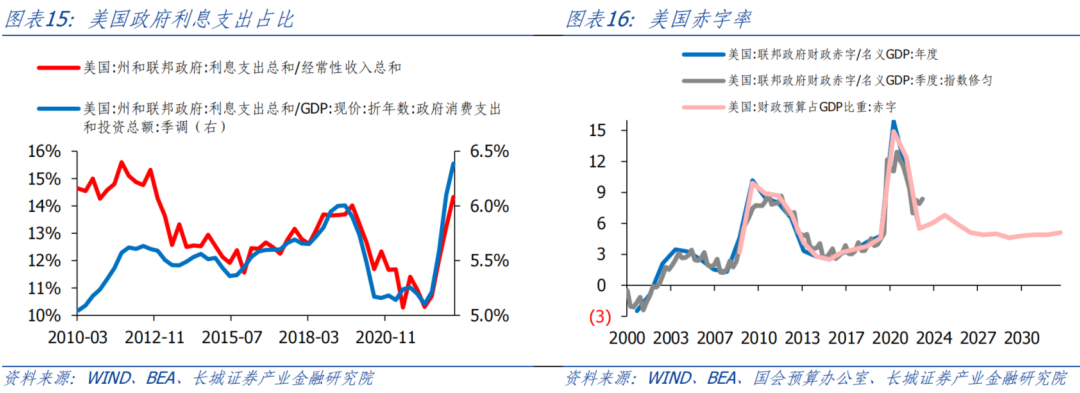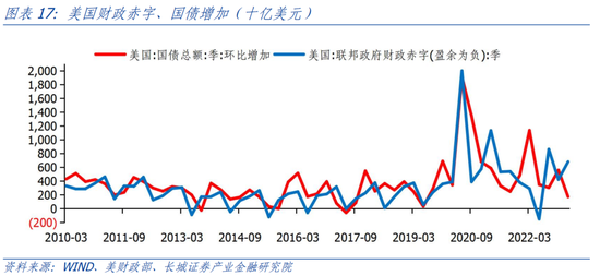美国国会预算办公室预计2023年和2024年财政赤字率上升至6.0%和6.8%,之后不断下降至5%左右,然后保持稳定。但我们认为美国赤字率近几年可能高于预期。2023年一季度美国财政赤字率为10.26%,明显高于预估的6.0%的赤字率水平。为了维持高利率下的债务持续以及维持经济增长,美国近几年财政赤字或将高于预期。6月3日,美国总统拜登签署联邦政府债务上限的预算法案,将暂停债务上限至2025年初。失去债务上限的硬约束后,美国财政部或将大幅增加新发国债规模。