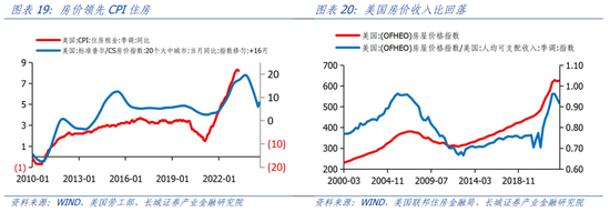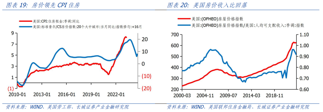 工资对通胀的推动主要通过以下两个方面:(1)对CPI住房具有推动作用;(2)对非住房服务价格具有推动作用。在核心通胀中,CPI住房权重约占42%。CPI住房包括住房等价租金和实际房租,均与房价相关。美国房价基本领先CPI住房12-18个月,2022年4月20大中城市房价同比增速见顶21.29%后开始回落,直到今年3月降至-1.15%。根据领先性,美国CPI住房同比也将不断下滑。但由于居民收入的上涨速度快于房价,目前美国房价收入比开始逐渐回落,房价下行的压力也逐渐缓解,成屋销售已经见底回升。房价可能会进入新一轮上涨之中,形成通胀在2024年二次反弹的风险。