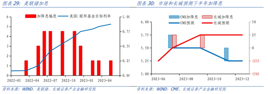 货币政策需要更加紧缩。美联储既要防止通胀反弹,又要防止深度衰退;既要防止紧缩不足,又要防止货币超调,矛盾点就来源于财政政策和货币政策方向不一致。美国财政扩张不仅阻碍了美联储货币紧缩的效果,而且也让高利率成为“地上悬河”,一旦财政撤力,货币超调的效果会立马显现。在这种复杂局面下,美联储下半年政策会更加谨慎,相机抉择调整利率。我们认为,大概率情况下,美国政府会继续扩张财政,经济高烧不退,美联储下半年可能分两次加息25bp至5.75%左右。小概率情况下,美国财政收缩,经济转入衰退,那么美联储相应可能降息。