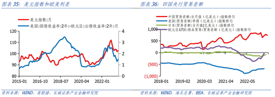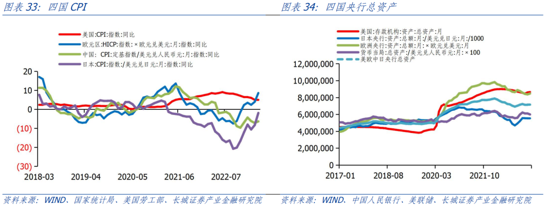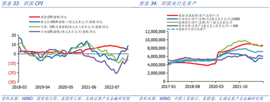 与此同时,主要国家之间的通胀走势也不相同。中日都面临低通胀的威胁,货币政策以宽松为主;而欧美面临高通胀压力,央行不断加息且资产负债表持续收缩。而正是由于中日两国以美元计价的资产负债表在2022年10月再次呈现扩张态势,使得中美欧日主要四国的资产负债表呈现出重新扩张趋势,抵消了欧美加息缩表的作用,这也是美元从2022年10月开始贬值的原因。