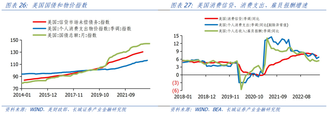 债务扩张也导致需求过热,主要表现在政府部门财政赤字和居民部门消费信贷。上文已经分析过了美国财政赤字和国债增长情况。在居民部门,债务扩张也同样存在。2023年3月,美国消费信贷同比增速7.27%,依然远高于2015年-2019年3.97%的平均增速。而且消费信贷增速高于工资增速,说明美国居民靠增加债务来维持消费。