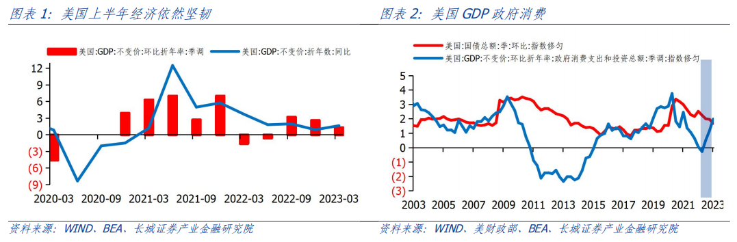 2023年上半年美国经济依然坚韧,并未出现衰退。在2022年7月19日我们提出《美国经济步入衰退周期》之后,2022年第三季度到2023年第一季度美国实际GDP环比折年率分别为3.2%、2.6%和1.3%。环比增速并未出现负增长,2022年上半年出现的技术性衰退并未持续。尤其是2023年一季度GDP增速,好于我们在2022年11月25日《美国经济或将深度衰退——2023年美国经济展望》中的预测。