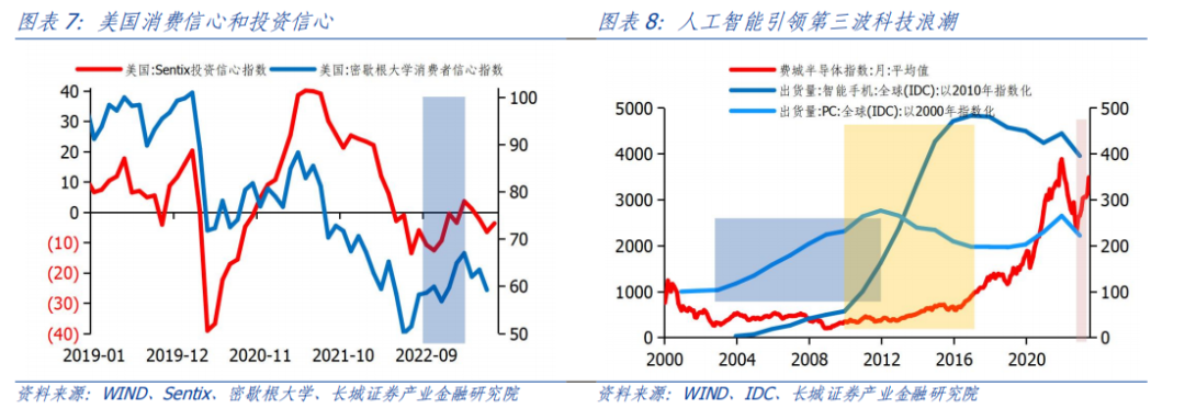 另一方面,美国科技进步迅速,AI发展推动投资热潮,提振经济信心。ChatGPT带火了人工智能领域。在2023年4月24日《AI开启科技浪潮,中美竞争更显激烈》报告中,我们判断“人工智能或将开启互联网时代以来第三波科技浪潮”。中美对于AI领域的投资将会更加深入。科技进步可以推动经济发展,提升消费信心。自2022年9月至2023年3月银行业危机前,美国投资信心和消费者信心持续回升。
