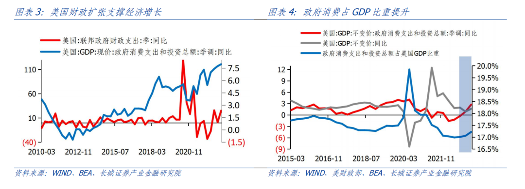 2023年前三月美国联邦政府财政支出分别为4861/5245/6913亿美元,合计1.7万亿美元,同比增长25.09%,环比增长17.62%。从名义GDP角度,2023年一季度美国政府消费支出和投资总额同比增长7.97%,高于美国名义GDP同比增长的7.06%。从实际GDP角度,2023年一季度美国政府消费支出和投资总额实际同比增长2.74%,高于美国实际GDP同比增长的1.62%,政府支出占GDP的比重也提升至17.22%。