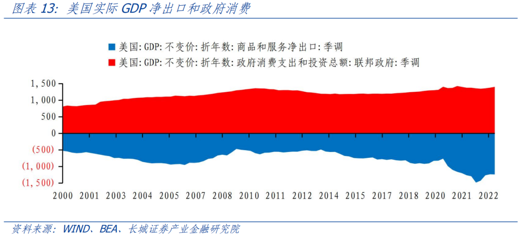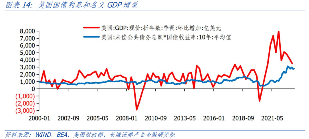 由于劳动力成本的快速上升,美国贸易品竞争优势下降,贸易赤字增加。为了弥补贸易赤字的影响,财政赤字不得不大幅增加。2022年贸易赤字为9511.87亿美元,创历史新高;联邦政府财政赤字为1.42万亿美元;联邦政府支出为6.29万亿美元。美国政府要维持财政支出驱动经济增长的趋势,政府债务可持续性就显得尤为重要。