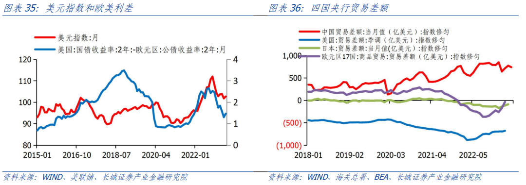 虽然美国经济增速整体下行,但世界经济正在触底反弹,各国分化逐渐加重,货币政策分道扬镳。以美元计价的欧洲和日本工业生产都是负增长,远远弱于美国和中国,因此才会出现2022年欧元和日本大幅贬值的现象。究其原因是2022年俄乌冲突爆发,能源价格大幅上涨,导致各国资源成本不统一。欧洲和日本都是能源依赖型,其出口能力大幅下降,工业成本大幅上升,造成生产降速、汇率贬值。2023年随着国际能源供需结构的调整,欧洲和日本的能源价格持续回落,工业生产快速恢复。