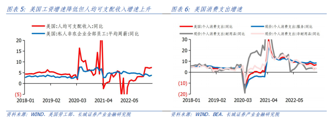 财政支出导致美国经济上半年超预期的强韧,主要表现在劳动力市场过热、人均可支配收入高增和消费需求旺盛,造成美国通胀回落缓慢。