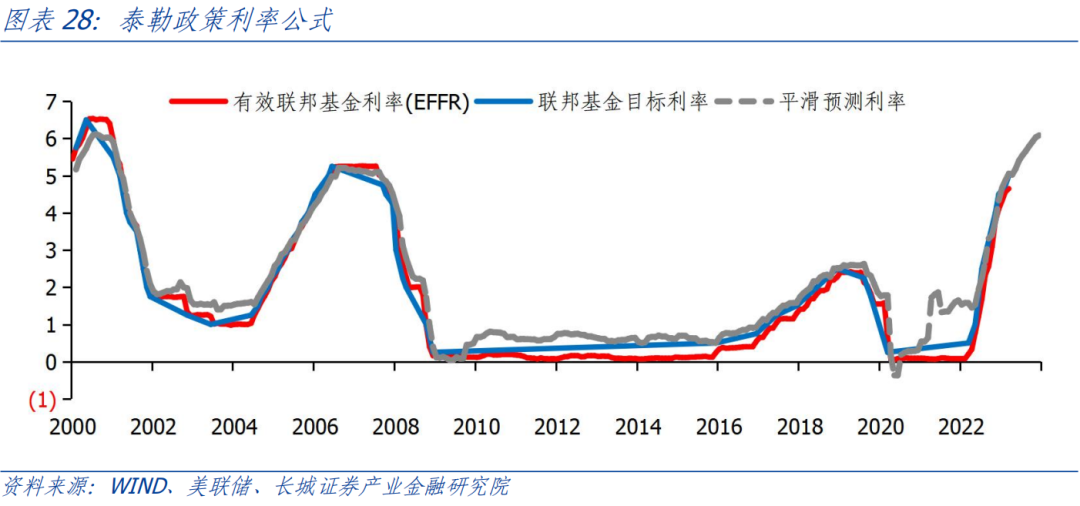 劳动力供给不足、财政相对积极和消费信贷增长是货币政策收紧力度不够的主要原因。由于财政支出并未如预期一样缩减,经济需求依然保持旺盛。以泰勒政策利率模型来计算,理论上现在美联储需要将基准利率提升至6%才能够促使通胀回落至2%的通胀目标水平。