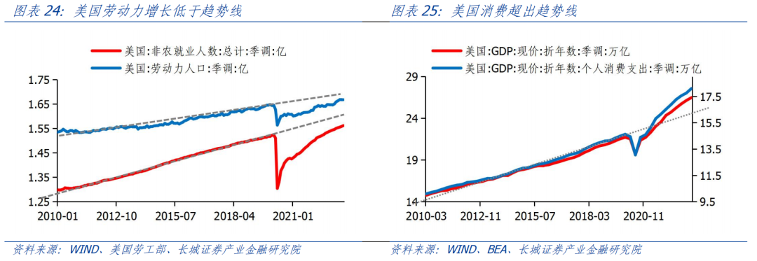 5月美国非农就业人数为1.56亿人,5月劳动力人口是1.67亿人,两者都未回到2019年之前的趋势线上。但居民消费支出和GDP都远远高于2019年之前的趋势线。比较而言,美国劳动力供给相对不足。根据贝弗里奇曲线明显外移的影响,劳动力缺口的产生抵消了收紧货币政策产生的通胀缺口。