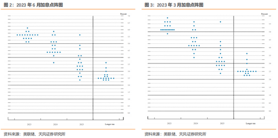 反映在最新加息点阵图中,可以发现,除两位委员将2023年的加息终点设定在5-5.25%,即不需要再度加息的情形外,其他票委均将加息终点至少设定为5.25-5.5%以上,即年内可能还需要两次加息。