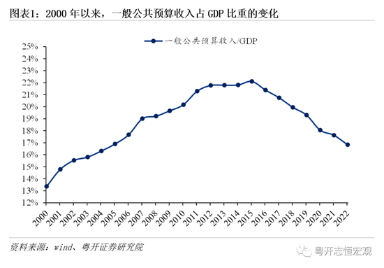 近年来随着宏观经济持续下行、政府主动作为减税降费退税,宏观税负持续下行、财政汲取能力下降,财政收支矛盾持续凸显、紧平衡成为常态。以一般公共预算收入/GDP衡量的宏观税负在2015年见顶,从2015年22.1%下降到2022年的16.8%,目前相当于2005年的水平。