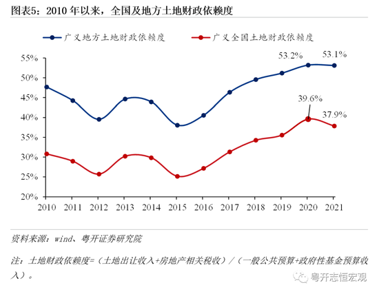 一是从收入体量来看,股权财政与土地财政相差巨大。2022年全国国有土地使用权出让收入66854亿元,即使较上年减少超两万亿元,相当于一般公共预算收入的61.4%;国有资本经营预算收入5689亿元,与土地出让收入体量相去甚远。同时“土地财政”不仅仅指政府性基金预算中的土地出让收入,还包括房地产贡献的相关税收,如开发环节的耕地占用税、城镇土地使用税、土地增值税、企业所得税,交易环节的增值税、契税、印花税以及居民转让环节的增值税和个人所得税等,同时还包括经营性房地产的房产税等。2021年土地财政贡献财税收入占全国财税收入(一般公共预算收入与政府性基金预算收入之和)近四成,达到37.9%,占地方政府的53.1%。